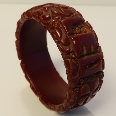 It's DEFINITELY Bakelite. It's DEFINITELY old. It's DEFINITELY hand-carved. It's DEFINITELY mine (those who know me know I have a Bakelite sickness weakness). I've been told the color is called Cherry Amber. Beyond that, it's pretty much a mystery! (And right up front, though all thoughts or comments are welcome...this has already been seen by several Bakelite aficionados/dealers, who had their own thoughts on it - possibly an "after-hours" or "home" carve"? All agree it's Bakelite, and it's OLD. It has also been in the hands of an expert who has verified that it is NOT of the Taiwaneese "Fakelite" ilk either, as the prior experts first concurred.)